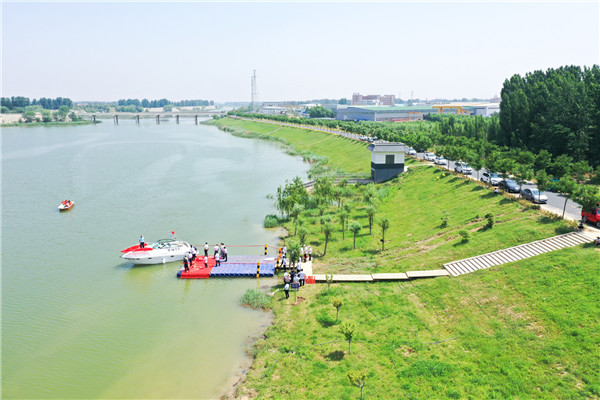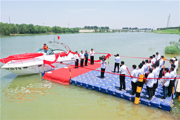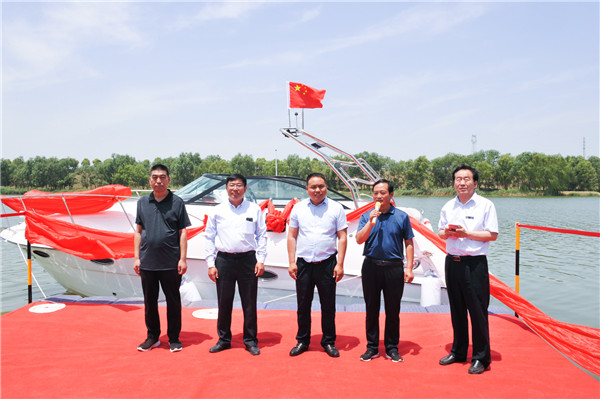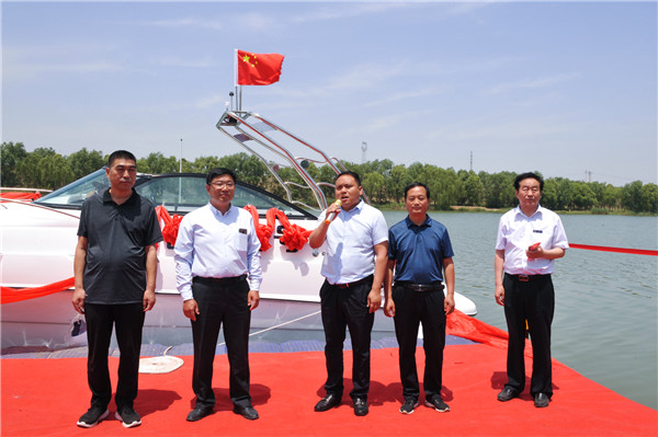 ▲長(zhǎng)垣市水利局副局長(zhǎng)付華鵬宣布“礦山1號(hào)”游艇下水啟航