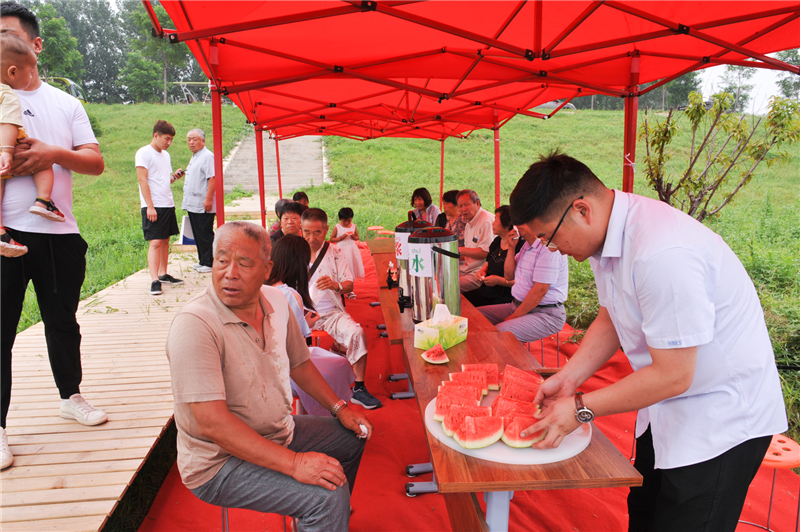 公司準備了西瓜、豆漿、綠豆水等解暑降溫物資,為員工父母暢游天然文巖渠提供溫馨服務。