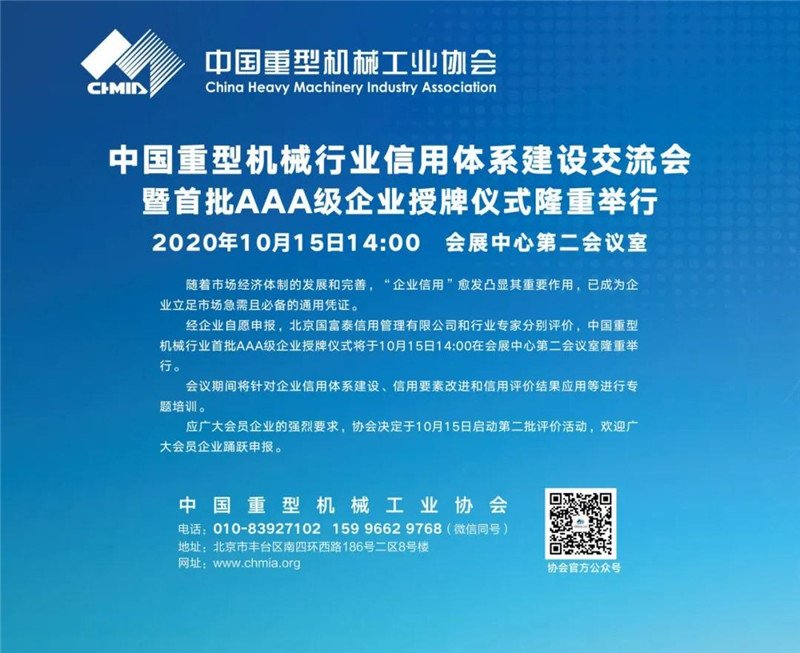 展會(huì)期間,河南礦山將在中國(guó)重型機(jī)械行業(yè)信用體系建設(shè)交流會(huì)上暨首批AAA級(jí)企業(yè)授牌儀式上,邀您一同參加企業(yè)信用體系建設(shè)、信用要素改進(jìn)及信用評(píng)價(jià)結(jié)果等專(zhuān)題培訓(xùn)。