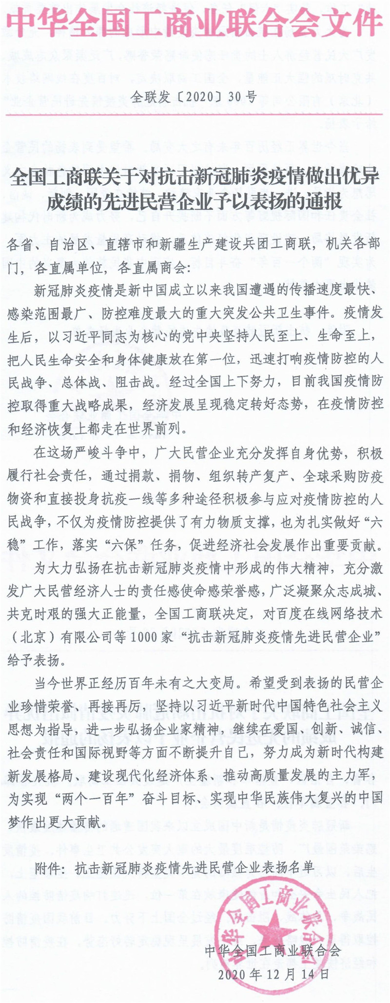 全國工商聯關于對抗擊新冠肺炎疫情做出優異成績的先進民營企業予以表揚的通報