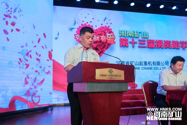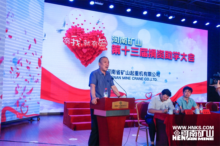 大會在莊嚴的國歌中拉開序幕。在公司工會主席張如志的主持下,縣人大副主任張繼忠首先做了熱情洋溢的致辭。他指出:河南礦山在崔培軍先生的領導下,全體員工披荊斬棘,全力拼搏,短短十余年便發展成為起重機行業翹楚,堪稱業內奇跡。更難能可貴的是,崔培軍先生富而有德、不忘大道,積極投身各種公益事業。多年來堅持捐資助學,大德昭示眾人,大愛普撒長垣,延續了中華民族扶危濟困的優良傳統。這種胸懷與行動,不但得到各級領導的肯定與支持,也受到廣大群眾的擁戴和贊揚,在社會上引發強烈反響。他深情地勉勵在座的大學生,資助是目的又不是終級目的,更多的是一種鼓勵和關愛。希望同學們牢記社會各界的關懷和愛護,繼續發揚刻苦學習的精神,正視并戰勝困難,向世人展示一個蒲城青年端莊穩重、誠實守信的精神風貌。