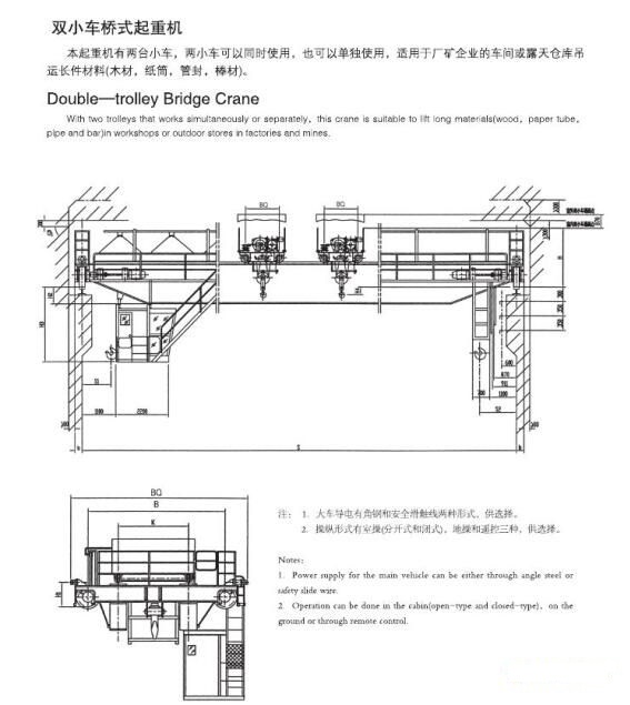 QE型橋式起重機主要由橋架、大車運行機構、小車、電器設備等組成。根據利用等級和載荷狀態不同,分為A5、A6兩種工作級別。本起重機有兩臺小車,兩小車可以同時使用,也可以單獨使用,使用于廠礦企業的車間或露天倉庫吊運長件材料。司機室平臺入口方向分側面入口,端面入口和頂面入口三種,圖示為側面入口。大車導電有軟電纜、安全滑觸線、角鋼滑線三種方式,應在司機室對側。